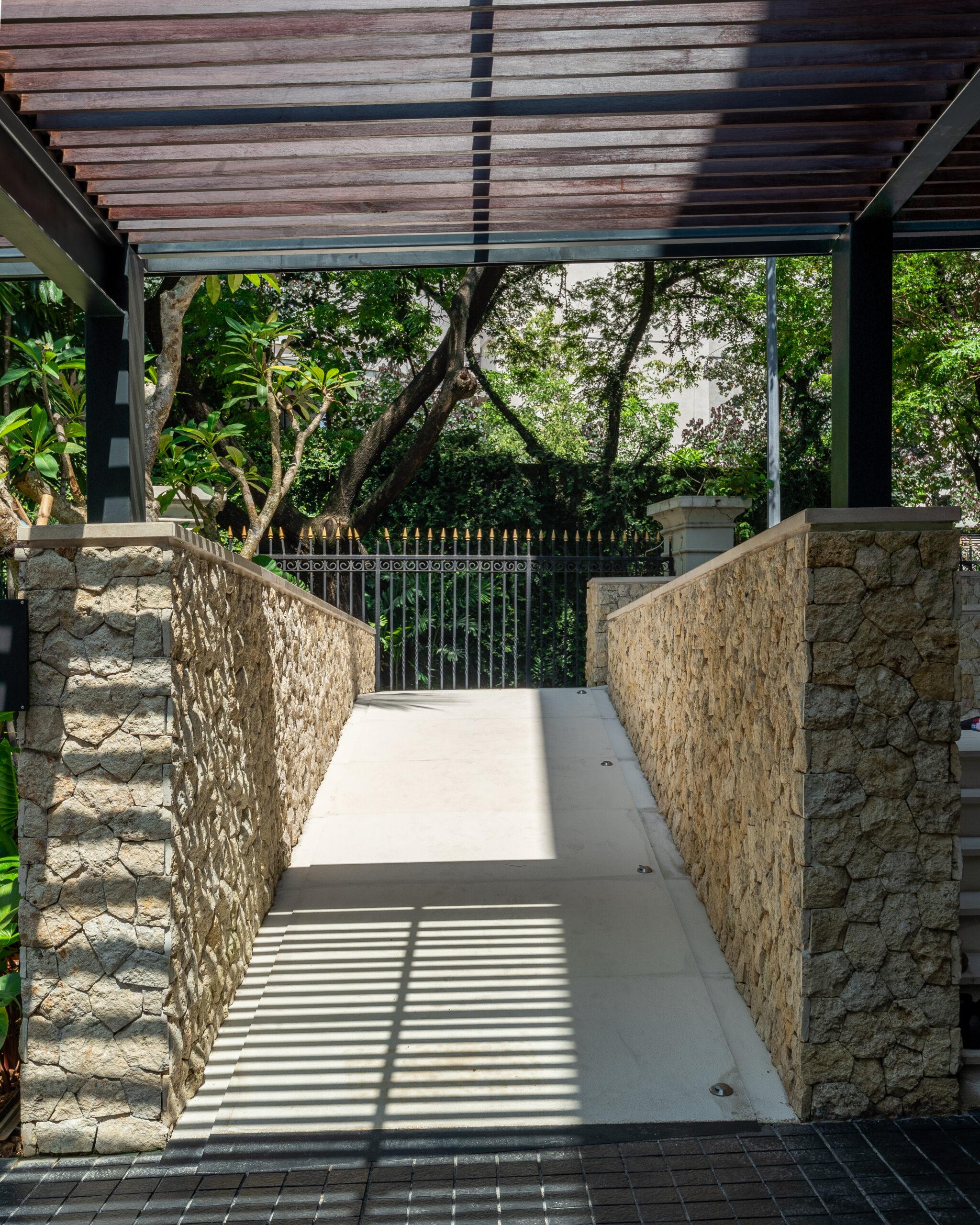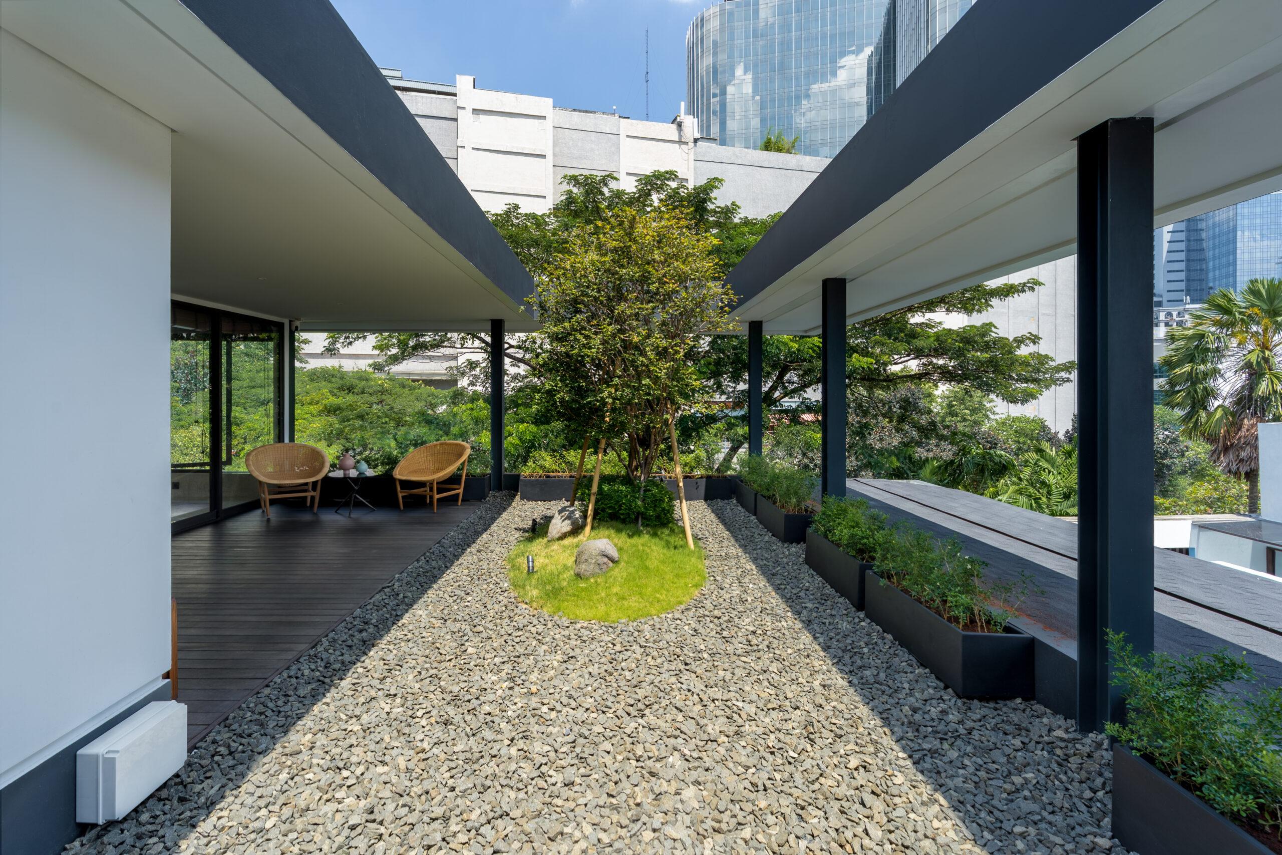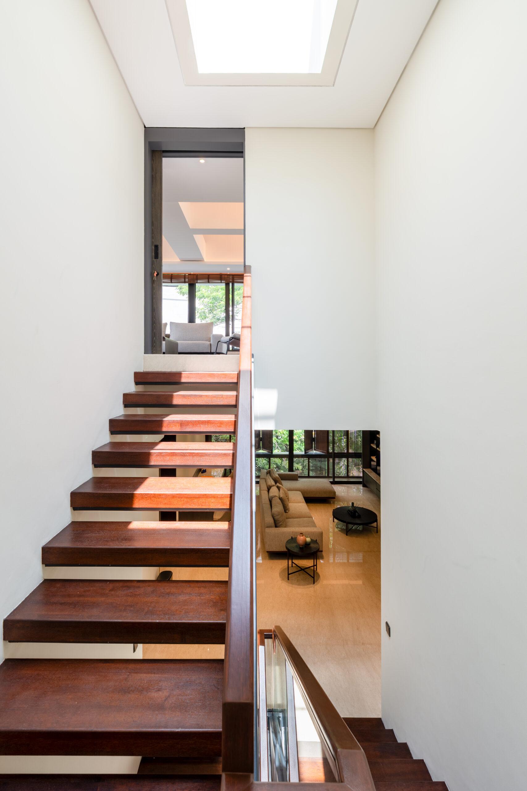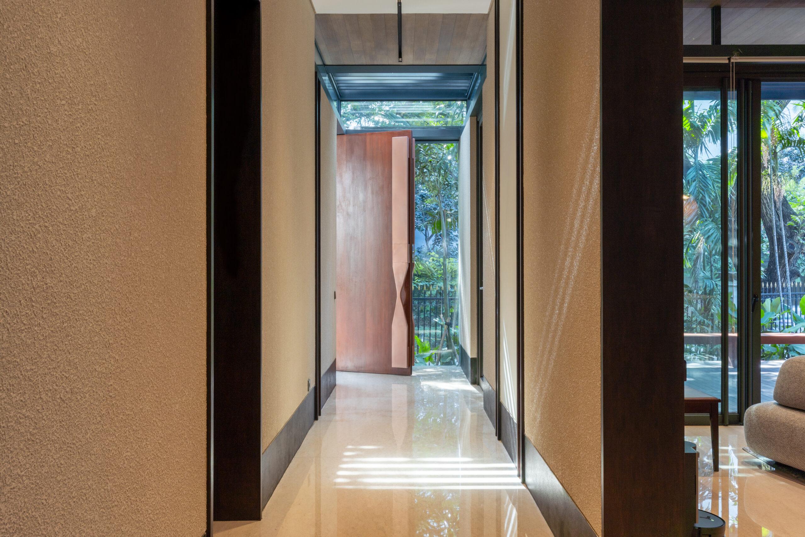 Natural ventilation plays a key role in maintaining thermal comfort throughout the house. Openings are positioned to enable cross ventilation, allowing air to flow freely between spaces and helping regulate indoor temperatures in a tropical climate. Large glass panels further strengthen the connection between indoor and outdoor environments, while ensuring that daylight penetrates deep into the living areas.