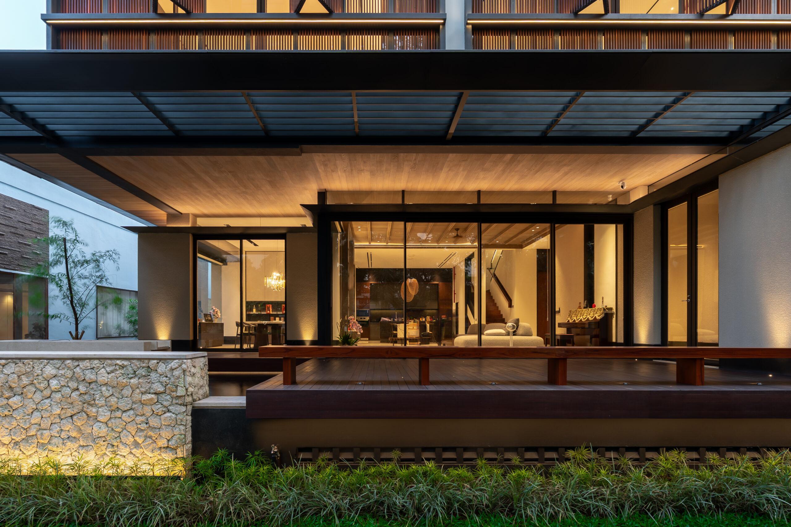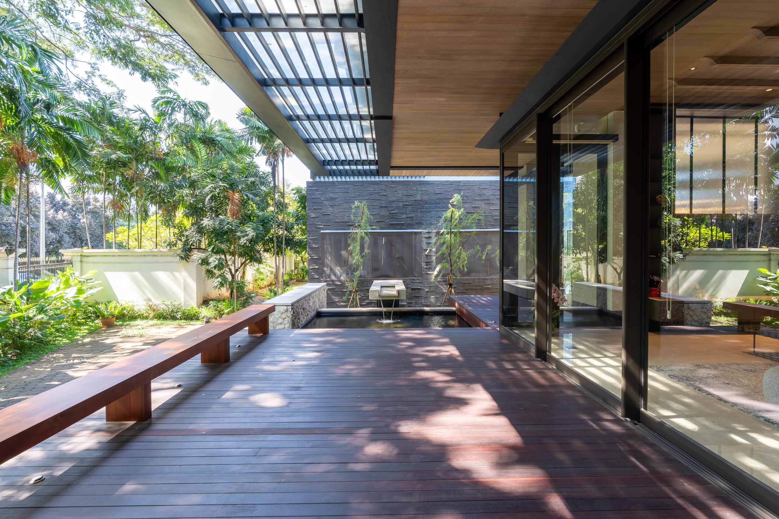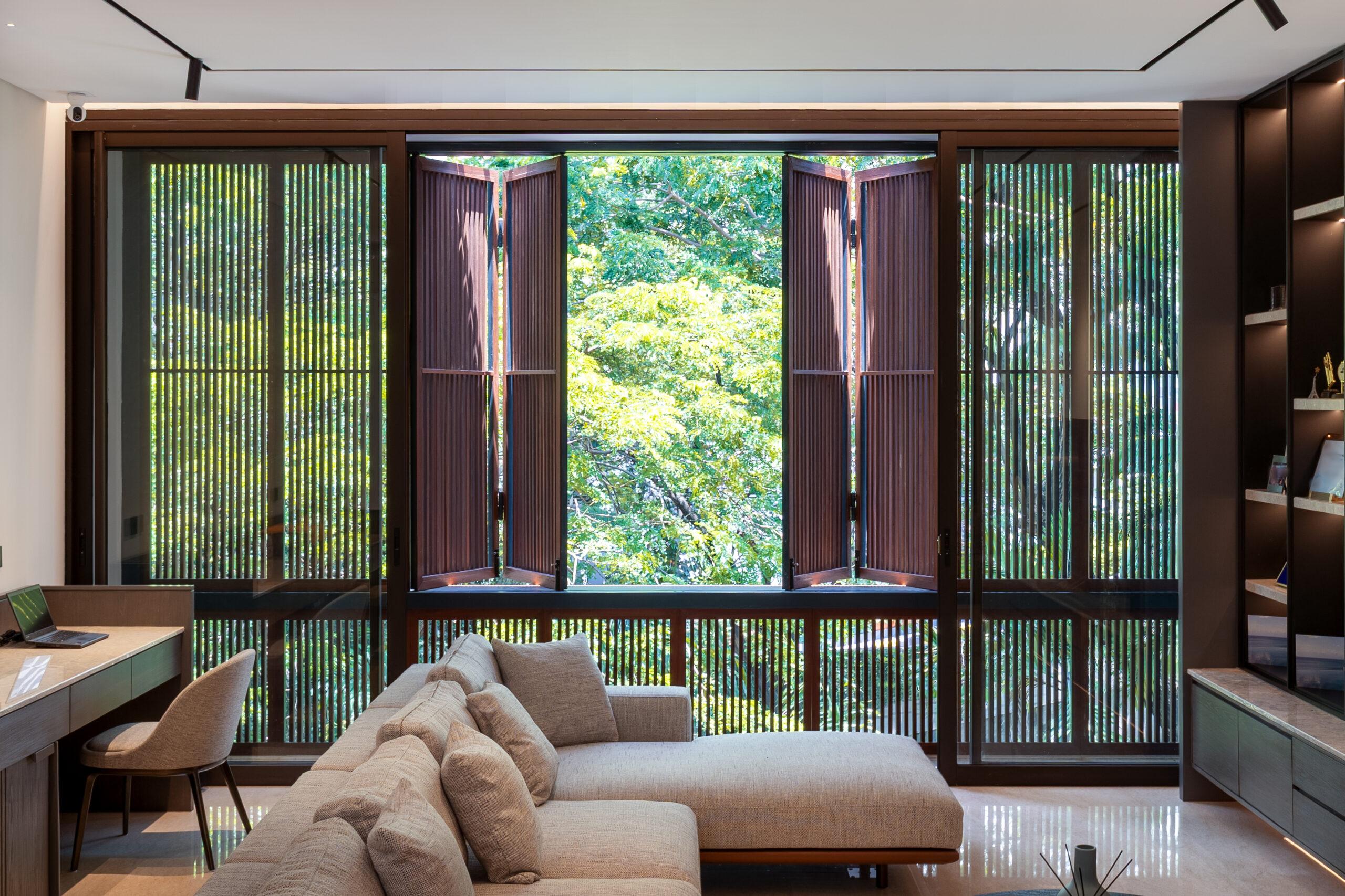 Material selection is equally intentional. The use of natural materials such as wood contributes to a warm and organic atmosphere, while also supporting thermal performance. These materials help absorb and release heat gradually, creating a more stable indoor environment throughout the day. The combination of glass and wood establishes a harmonious relationship between modern design and tropical sensibility.