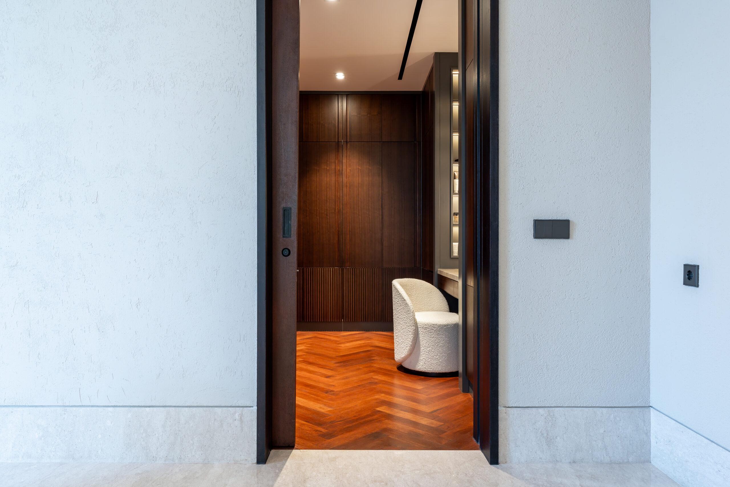 As a passive design-oriented project, the house is carefully oriented to optimize natural light while minimizing excessive heat gain. The facade integrates horizontal wooden elements that function as sun shading devices, reducing direct solar exposure while allowing soft daylight to filter into the interiors. This strategy not only enhances visual comfort but also reduces dependency on artificial cooling and lighting.