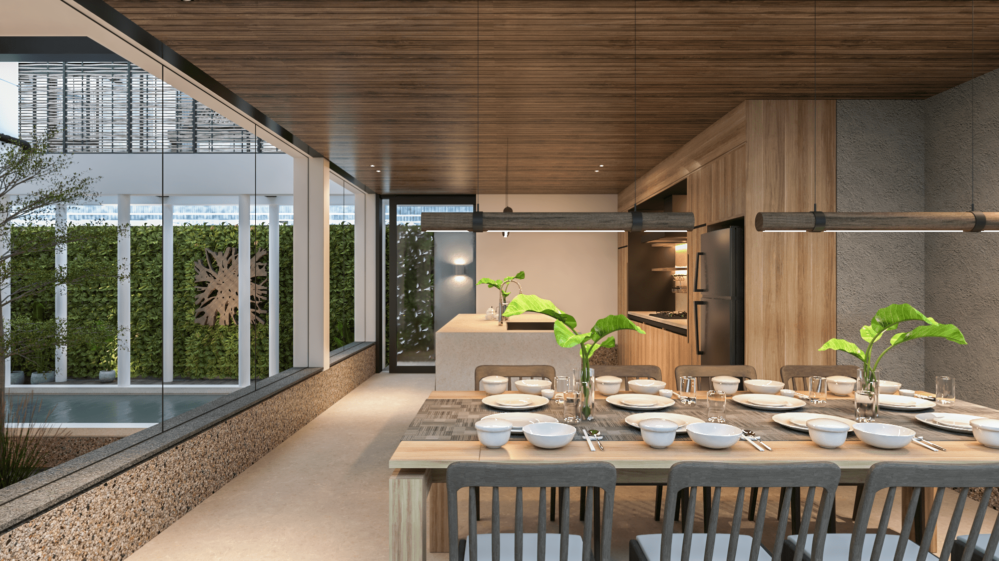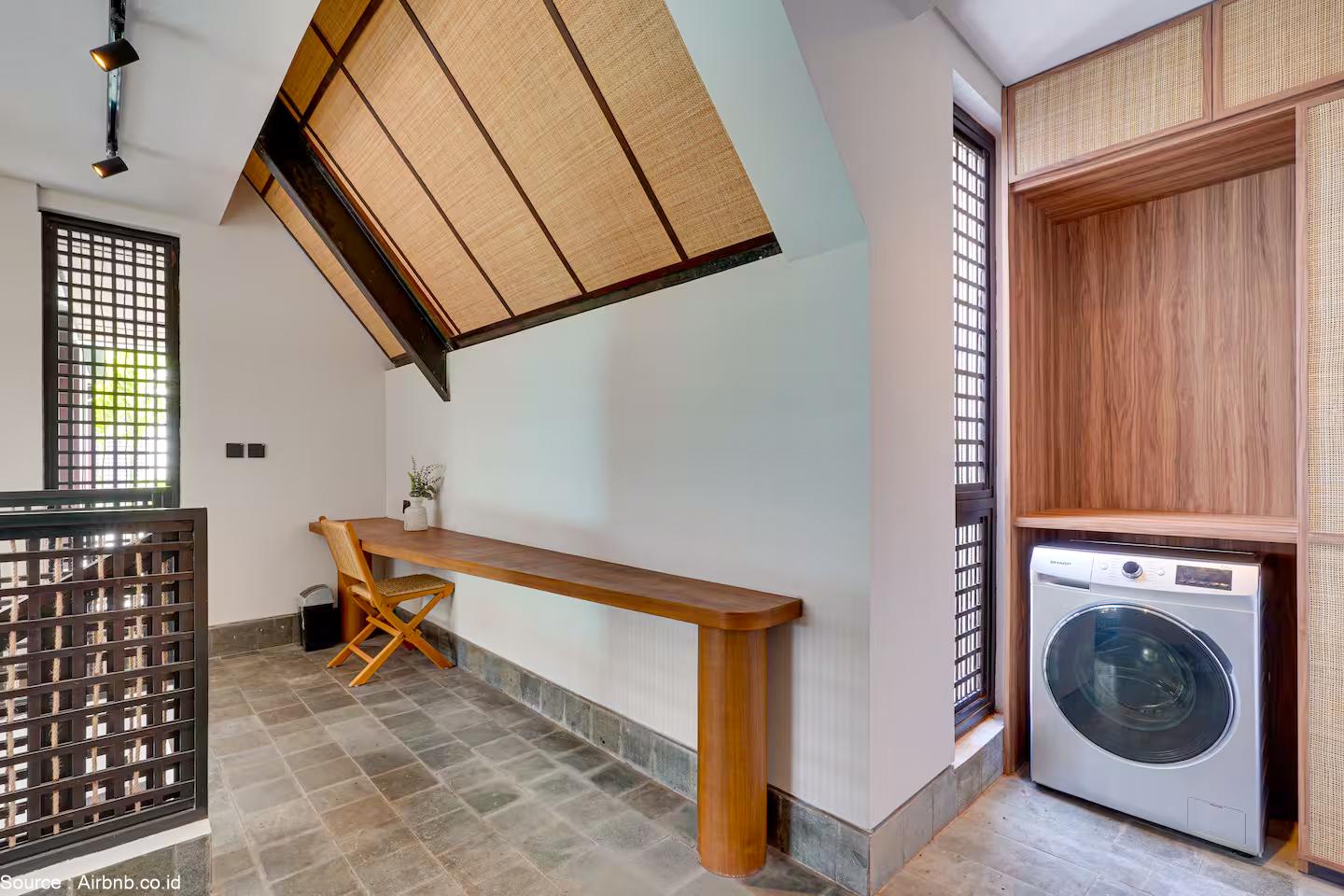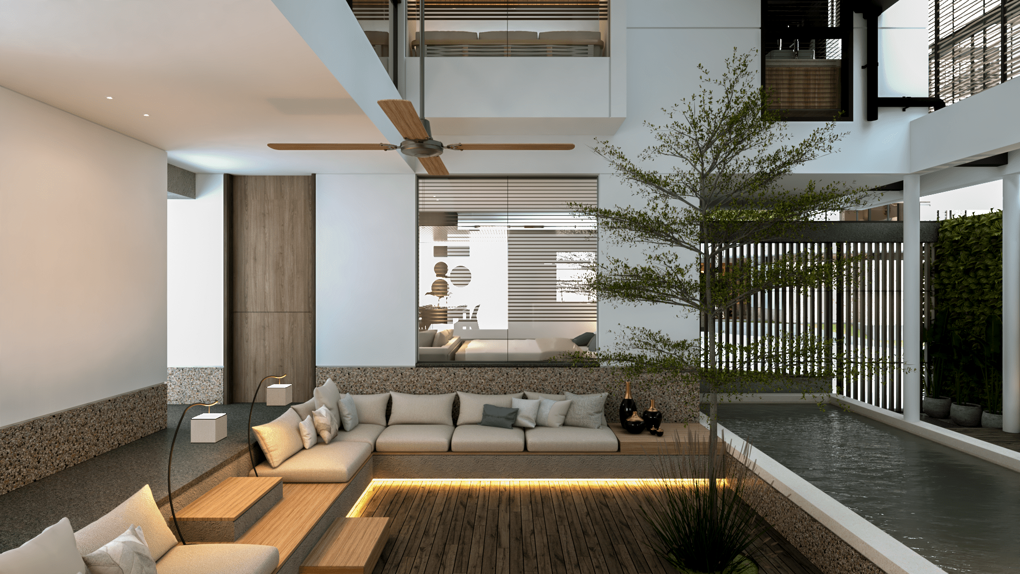 Traditional woven patterns on shutters not only serve technical functions in a tropical climate but also honor local culture. These shutters, combined with wooden frames and steel structures, maintain harmony with modern architectural elements. Skylights, large windows, and transparent walls maximize natural light, while overhangs and shading devices balance illumination and heat control. Cross-ventilation ensures a cool environment without excessive reliance on artificial cooling systems.