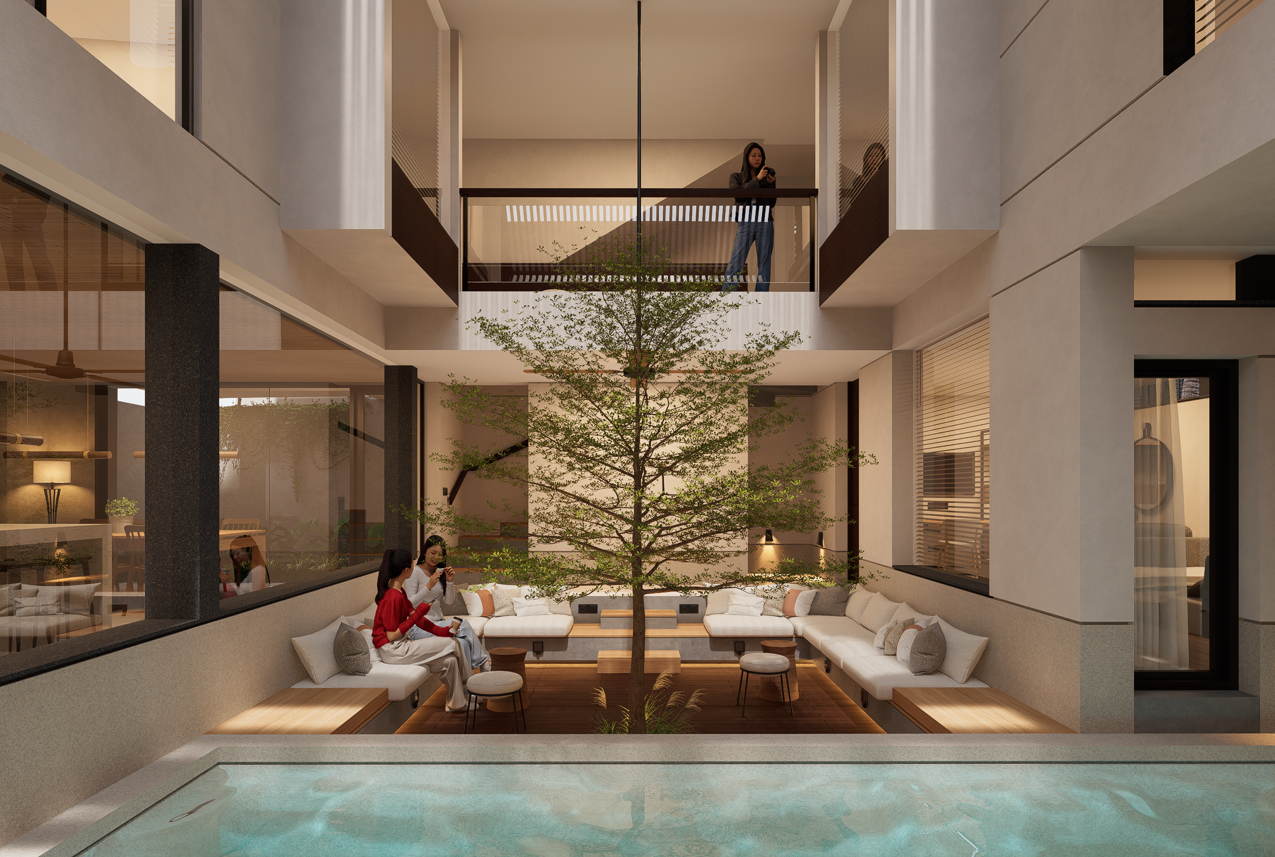 The spatial concept of The Pasisi begins with the building’s orientation towards the southwest, where the nearest sea lies, in accordance with the Asta Kosala Kosali principle that non-sacred buildings should face the ocean. The design incorporates transitional spaces, exemplified by the changing heights of corridor areas leading to the main lounge, which is semi-outdoor with a high ceiling and surrounded by greenery.