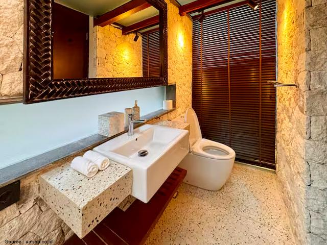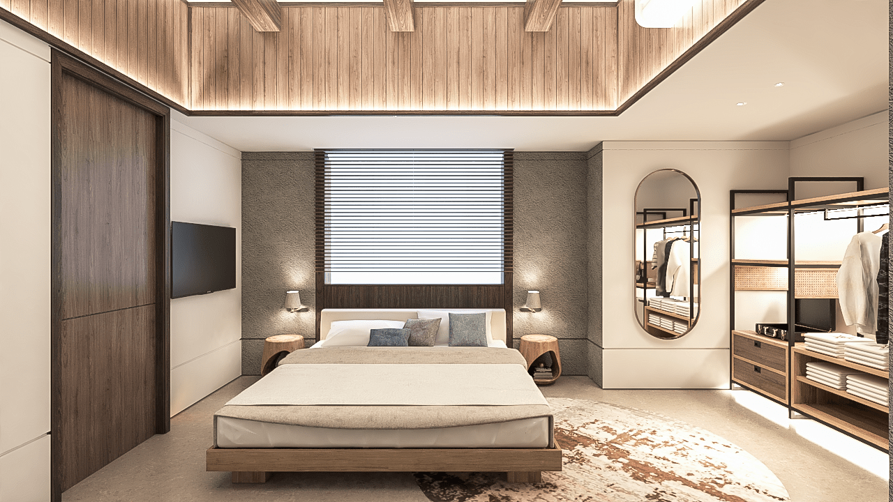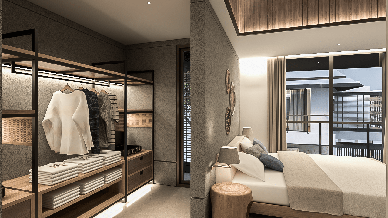 Shutters made of wood and bamboo align with nature, while rattan ceilings and wooden furniture evoke warmth. Exterior materials, such as shingle roofs combined with steel structures and thermal insulation, provide both thermal and acoustic isolation. Additionally, paras stone walls reduce heat transfer, creating a cool and textured environment that holistically stimulates the senses.